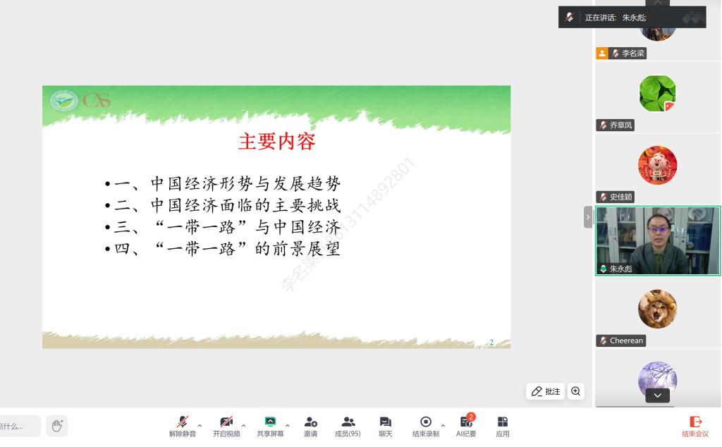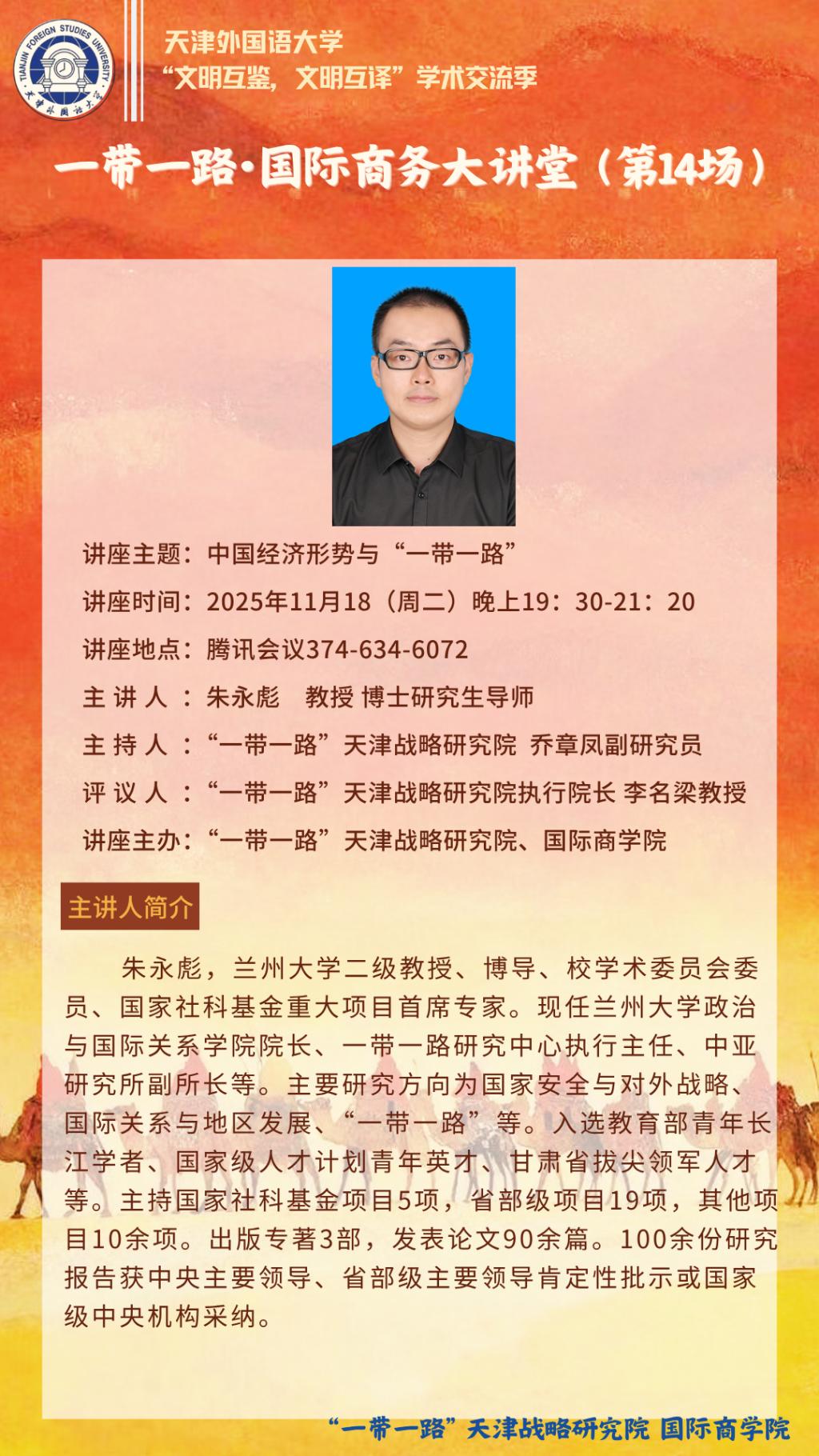 2025年11月18日,“一带一路”天津战略研究院特邀兰州大学政治与国际关系学院院长、一带一路研究中心执行主任、中亚研究所副所长朱永彪教授、博士生导师做客"一带一路"国际商务大讲堂,做了主题为《中国经济形势与“一带一路”》的专题学术报告。